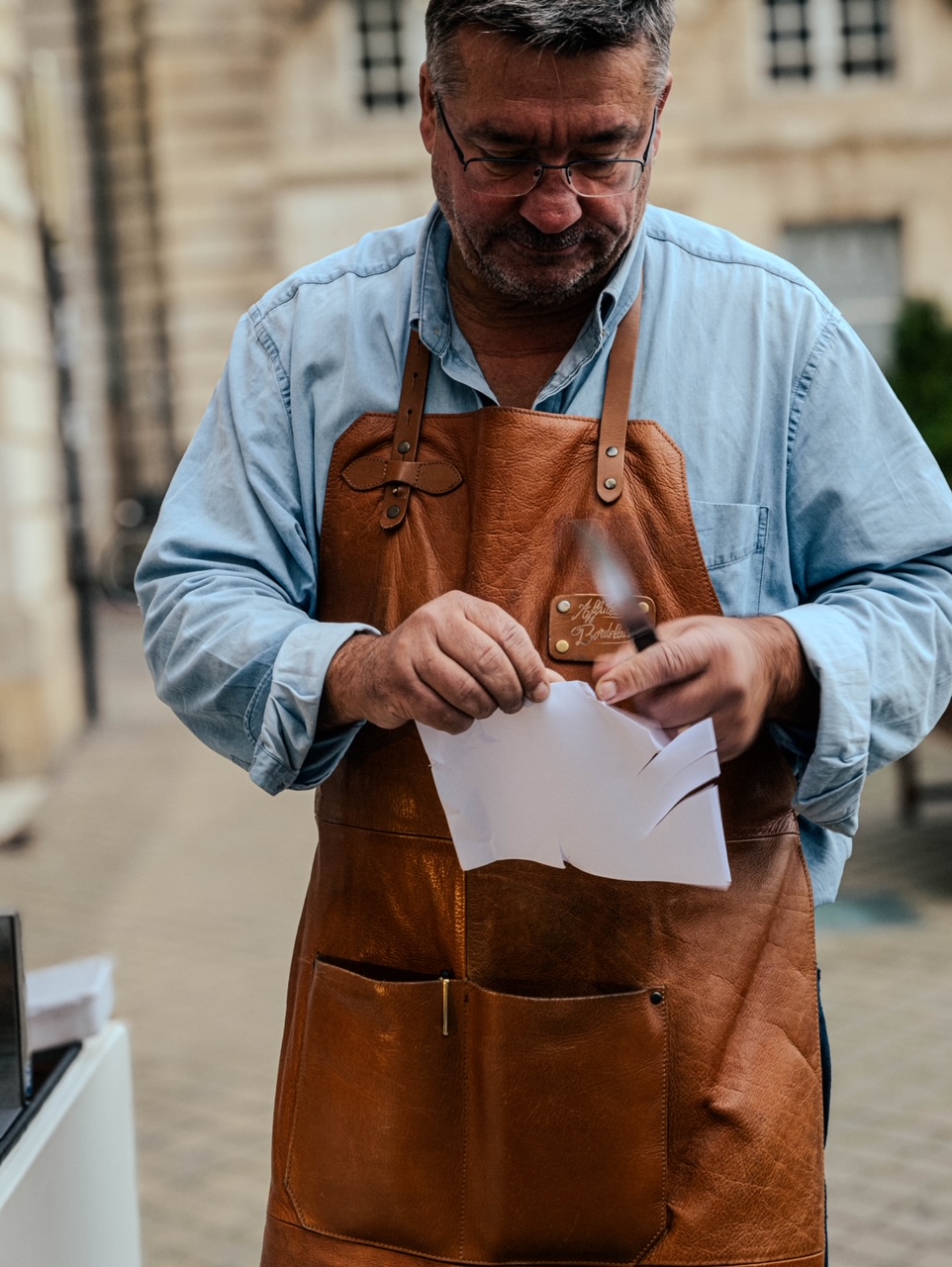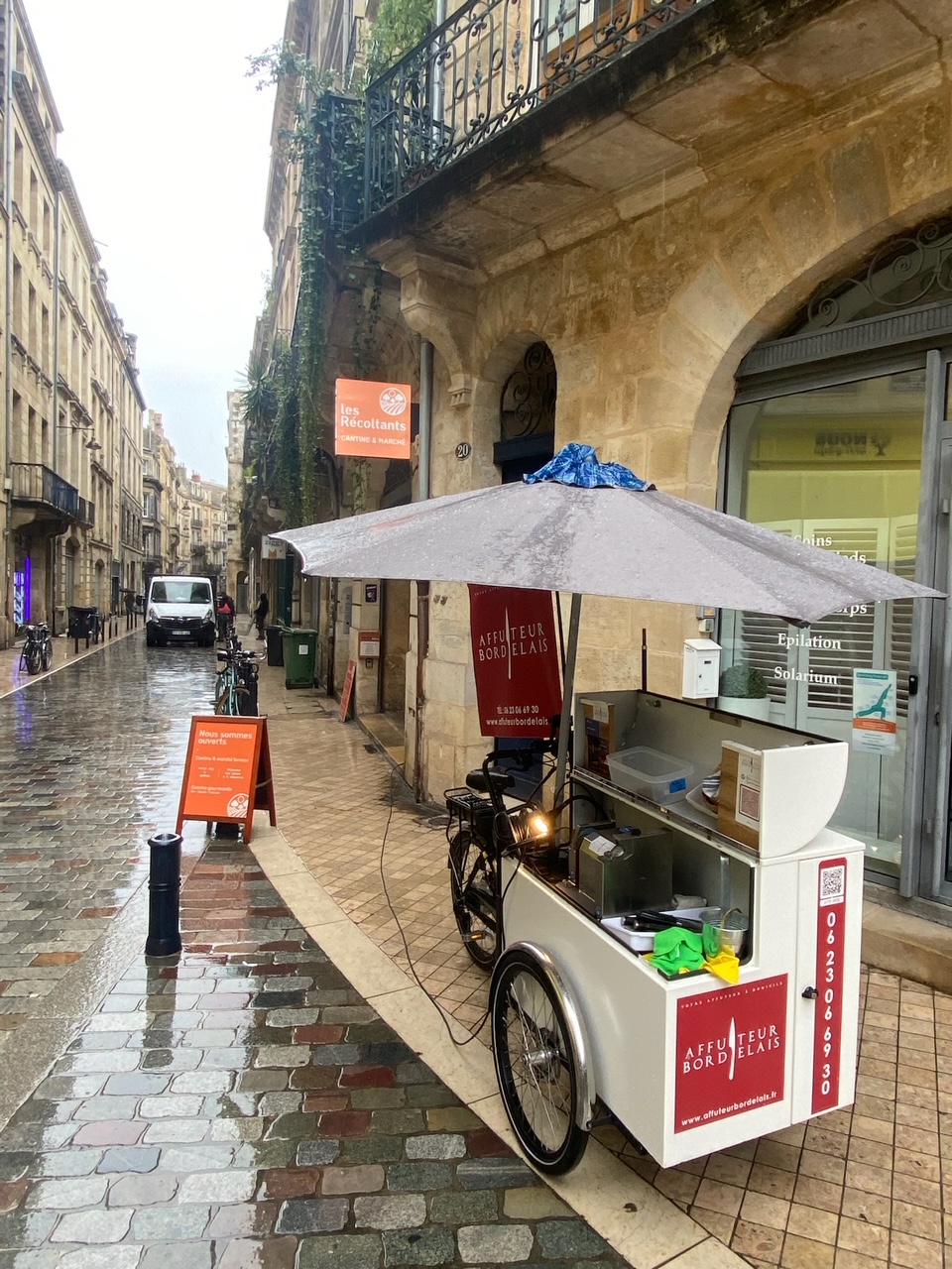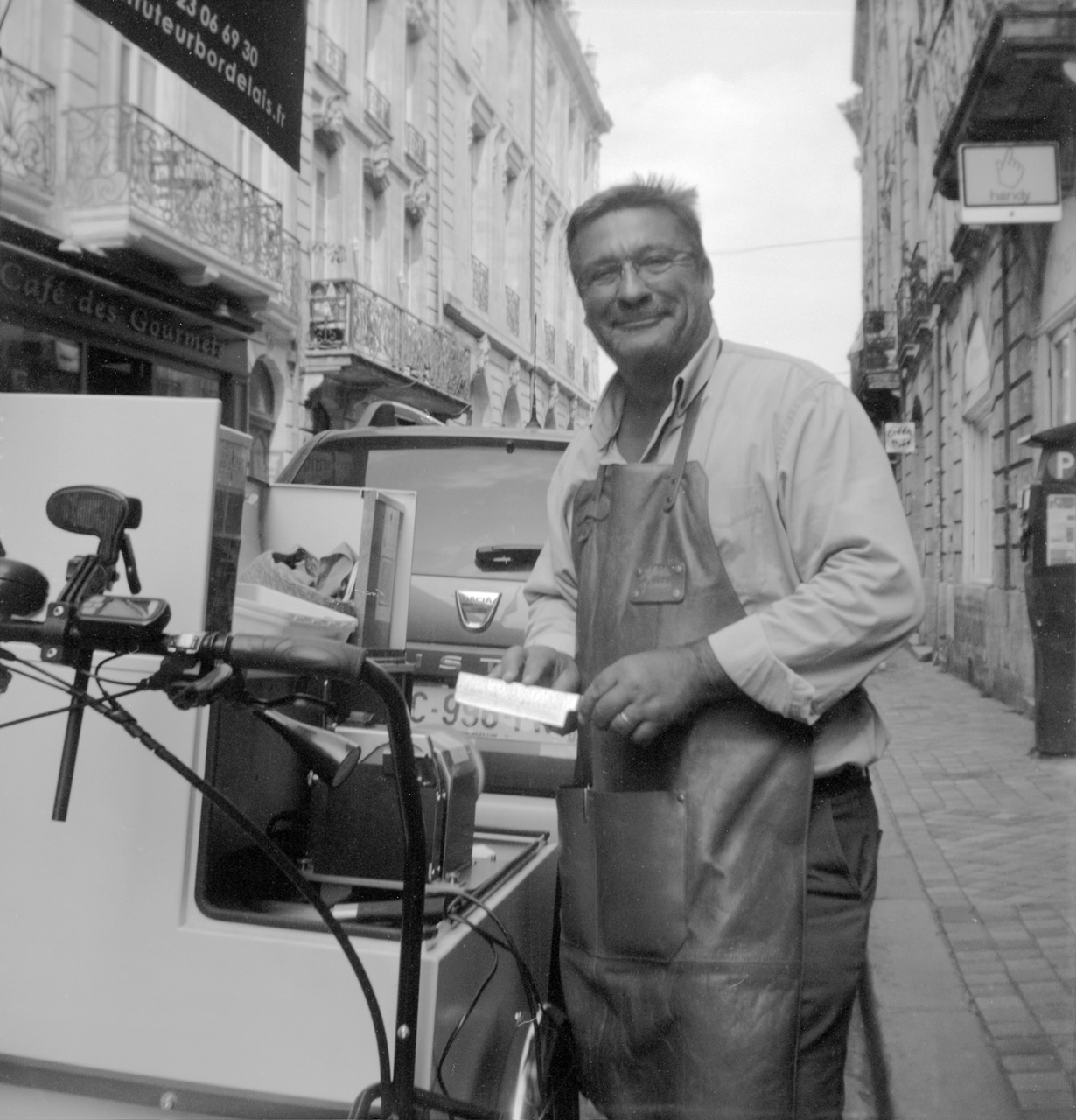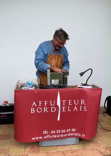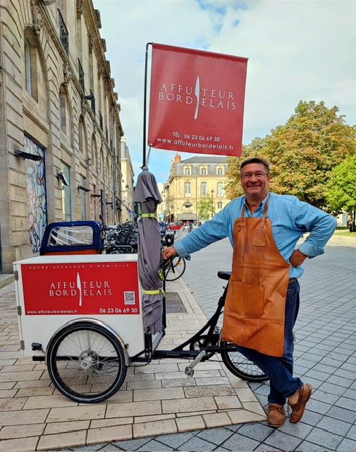 artisan ambulant sur son vélo-cargo ou voiture-atelier, vous propose l'affûtage de vos couteaux sur votre pas-de-porte, devant votre établissement.