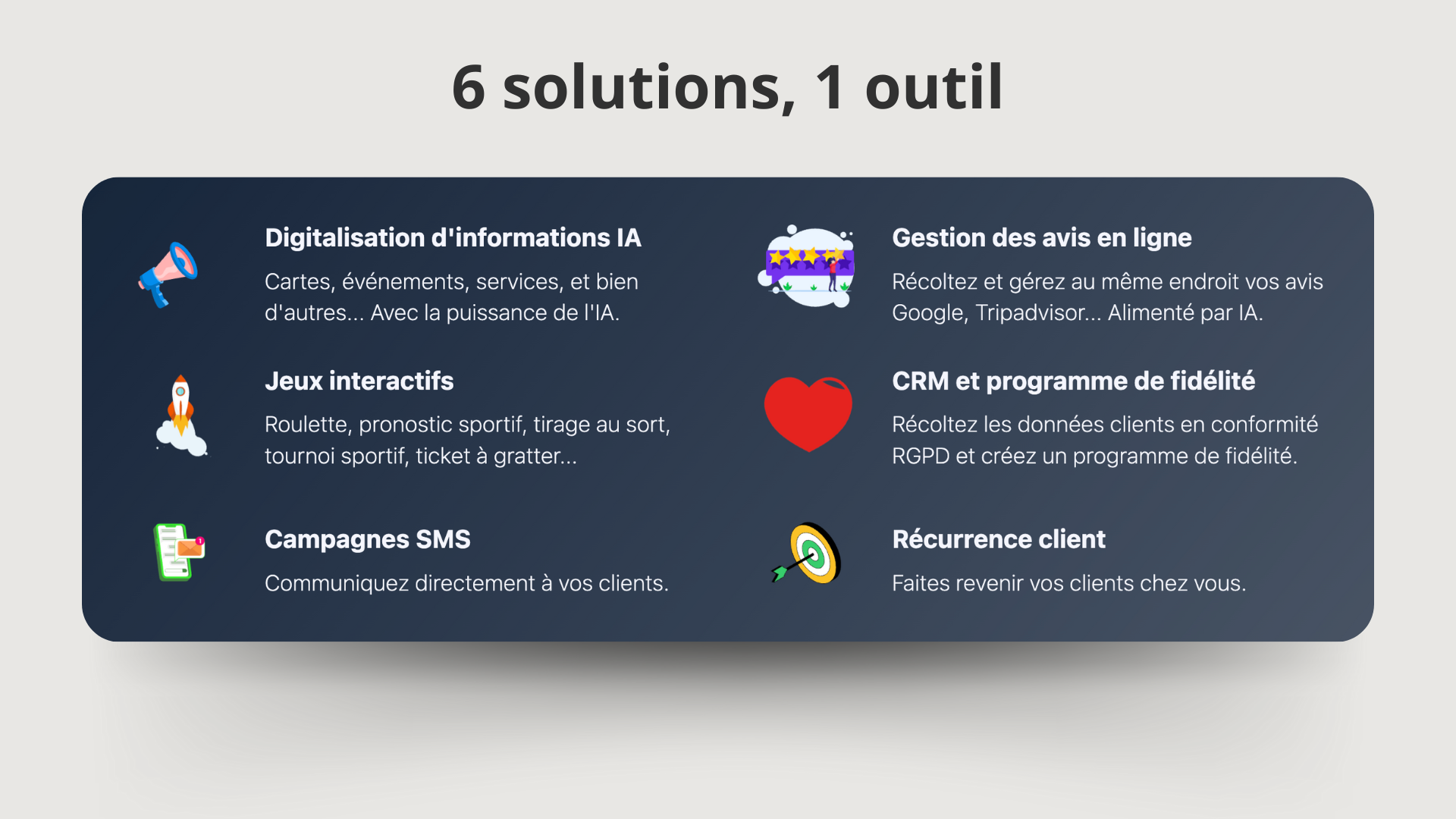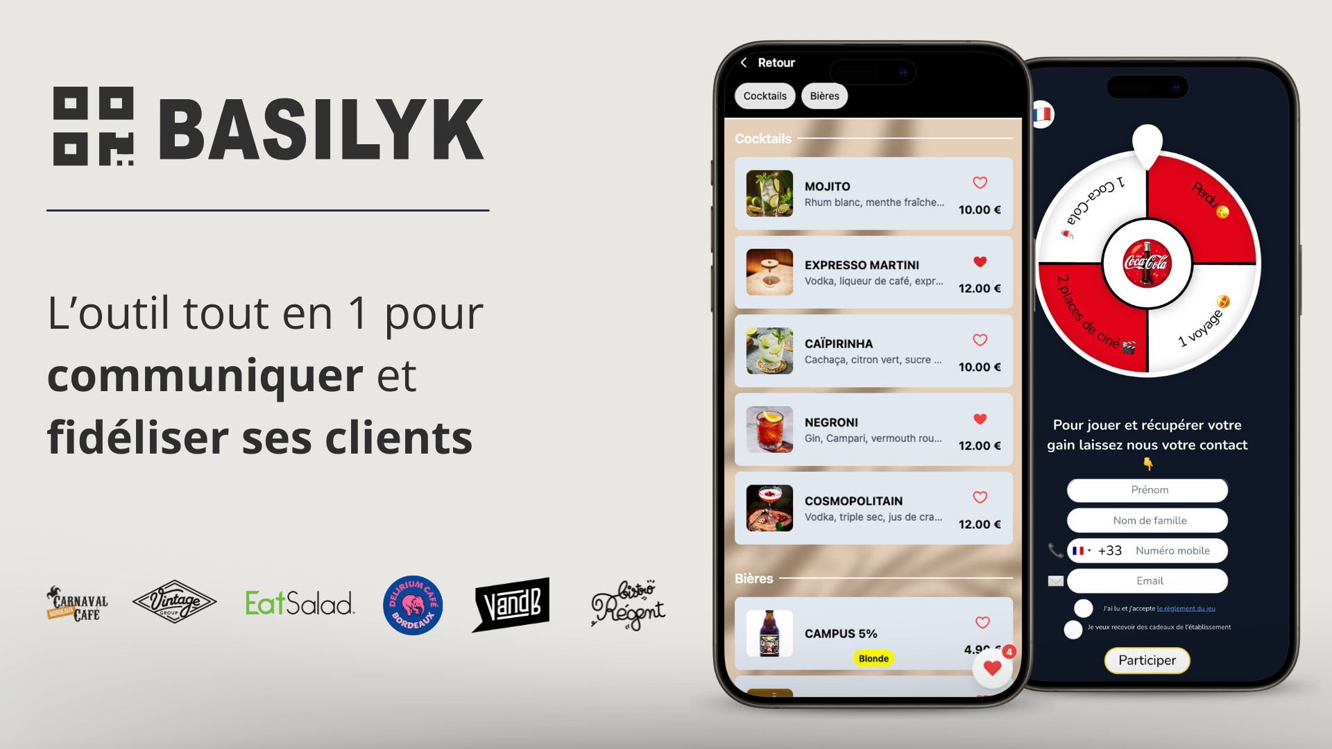 Basilyk aide les restaurants, bars, hôtels et campings à communiquer et fidéliser leurs clients grâce à une solution tout-en-un : menu digital instantané, jeux interactifs, campagnes SMS, CRM et gestion d’avis. Simple et efficace, la plateforme permet de fidéliser, analyser et augmenter les ventes — avec une offre gratuite et sans engagement.
