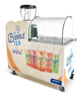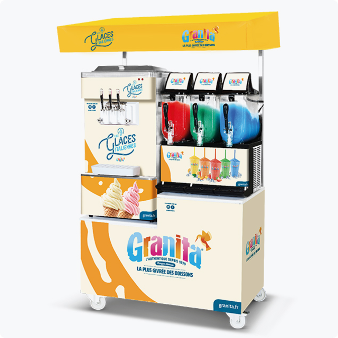 Concept comprenant un meuble roulant, une machine à Glaces Italiennes, une machine à GRANITA, une bâche panoramique, stockage dans le meuble