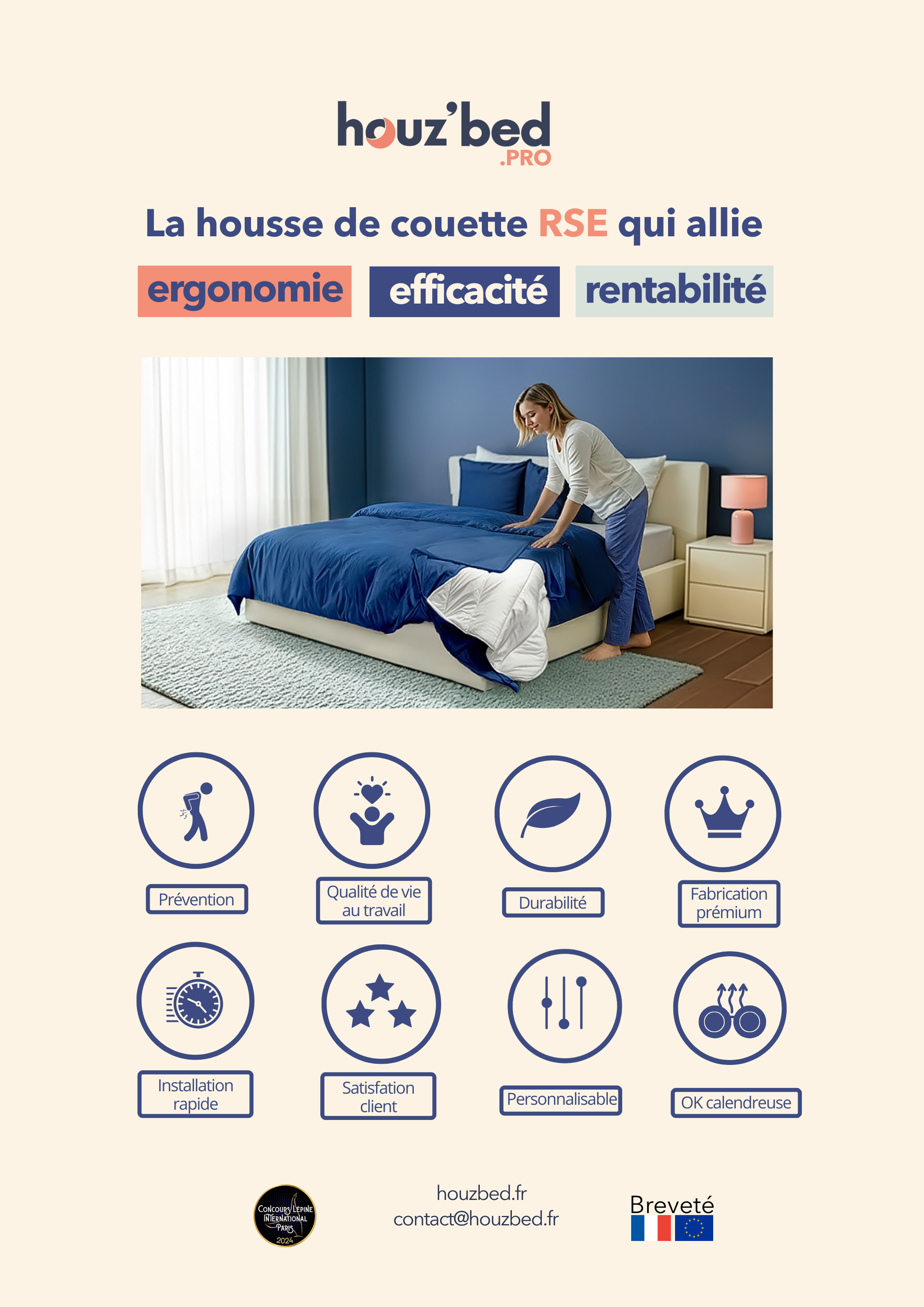 Houz’Bed est une housse de couette innovante, équipée d’un zip discret sur toute la longueur pour permettre une installation rapide, sans porter ni secouer la couette. Conçue pour réduire les efforts physiques, elle limite les gestes à risque et contribue directement à diminuer la pénibilité du travail dans les établissements d’hébergement.
